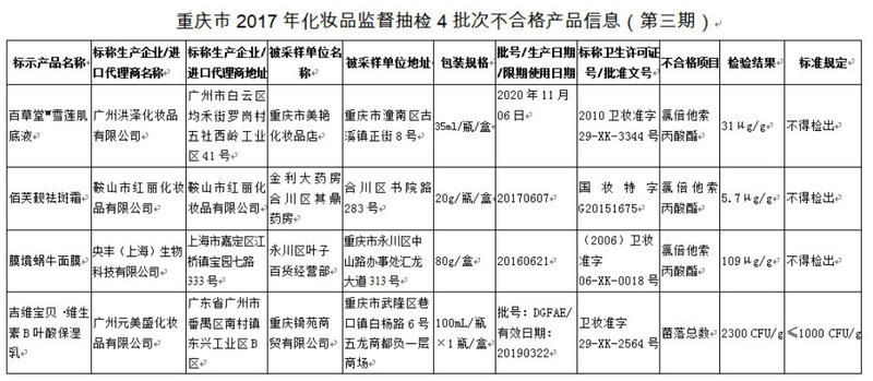 近日,经济日报-中国经济网时尚频道从国家食品药品监督管理总局官网了解到,重庆市食品药品监督管理局在重庆市组织开展的2017年化妆品监督抽检中,发现标示名称为“百草堂·雪莲肌底液”等4批次产品不合格。其中,百草堂·雪莲肌底液、佰芙靓祛斑霜、膜境蜗牛面膜等产品内查出含有激素类禁用物质氯倍他索丙酸酯;吉维宝贝·维生素B叶酸保湿乳被检出菌落总数超标,值得注意的是,这款化妆品是供孕妇孕期使用的产品。