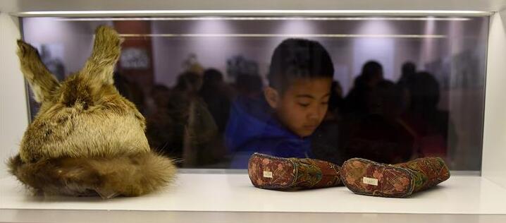 1月23日,一名小朋友在观看展出的少数民族日常生活用品。当日,中华家风文化主题展在北京中华世纪坛拉开帷幕。展览根据家风的形成与特点,分为“家”、“家教”、“家风”三个部分,通过各类型海内外华人家庭的家教、家风故事,展示了中华家风的生命力、凝聚力及其在新时代的风采。新华社记者 罗晓光 摄