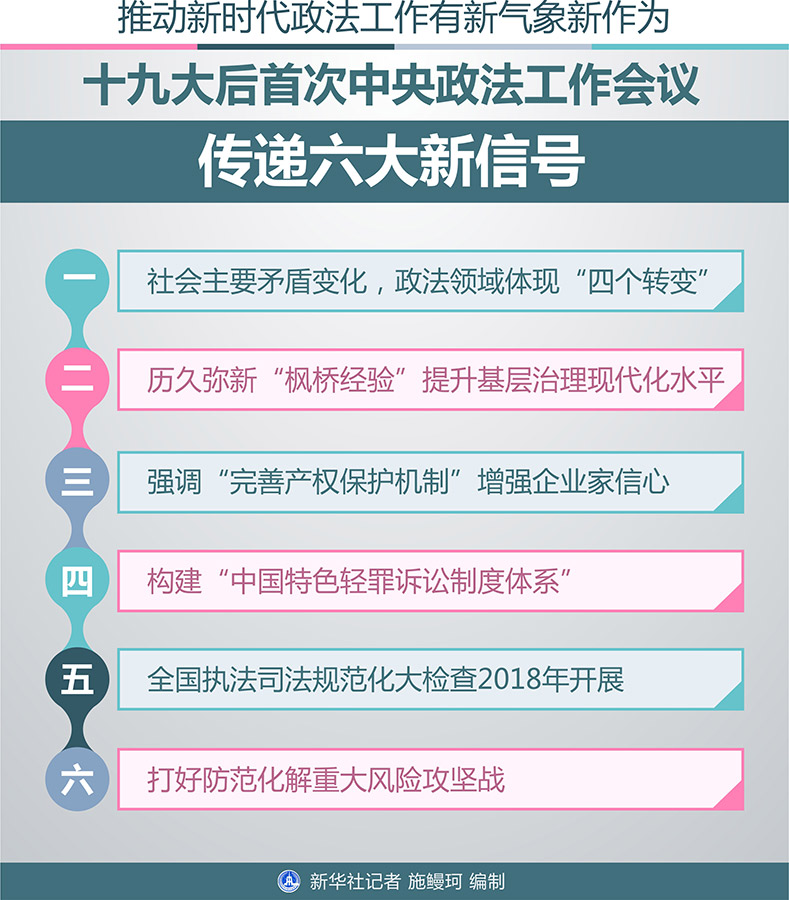 新时代政法工作如何履行好党和人民赋予的职责使命?2018年政法工作提出哪些新要求、作出哪些新部署?22日至23日,党的十九大后首次召开的中央政法工作会议传递了新信号。新华社记者采访权威专家为你解读。