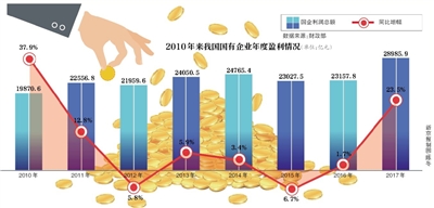 2017年1-12月,我国国有企业利润总额28985.9亿元,同比增长23.5%,创2011年来最大增幅。记者查询数据发现,2010年-2016年,我国国有企业利润总额同比增幅分别为37.9%、12.8%、-5.8%、5.9%、3.4%、-6.7%、1.7。