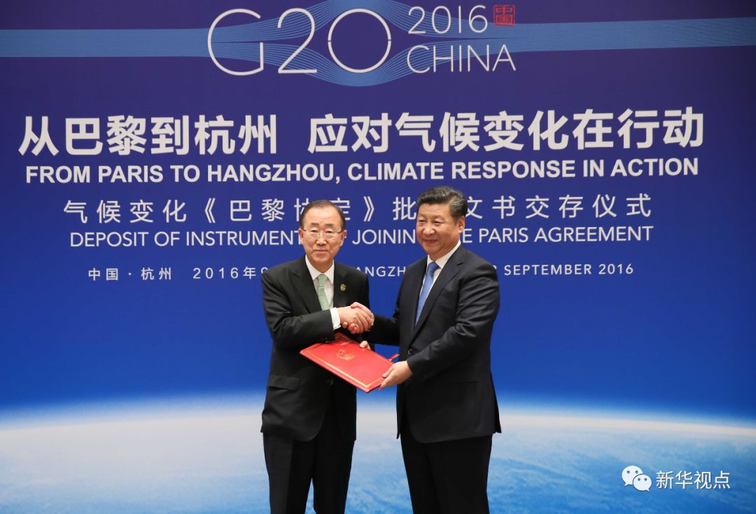 ↑2016年9月3日,习近平向潘基文交存中国气候变化《巴黎协定》批准文书。新华社记者兰红光摄