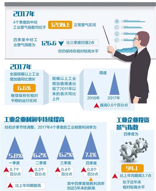 二是通过近年来的持续增长,随着规模的扩大,新动能的拉动作用进一步增强。2017年,装备制造业和高技术产业增加值同比增长11.3%和13.4%,增速在2016年基础上提高1.8个和2.6个百分点。经初步季节调整,2017年IT设备行业、医药行业增加值分别同比增长13.9%和12.3%,比规模以上工业平均增长水平高7.3个百分点和5.7个百分点。