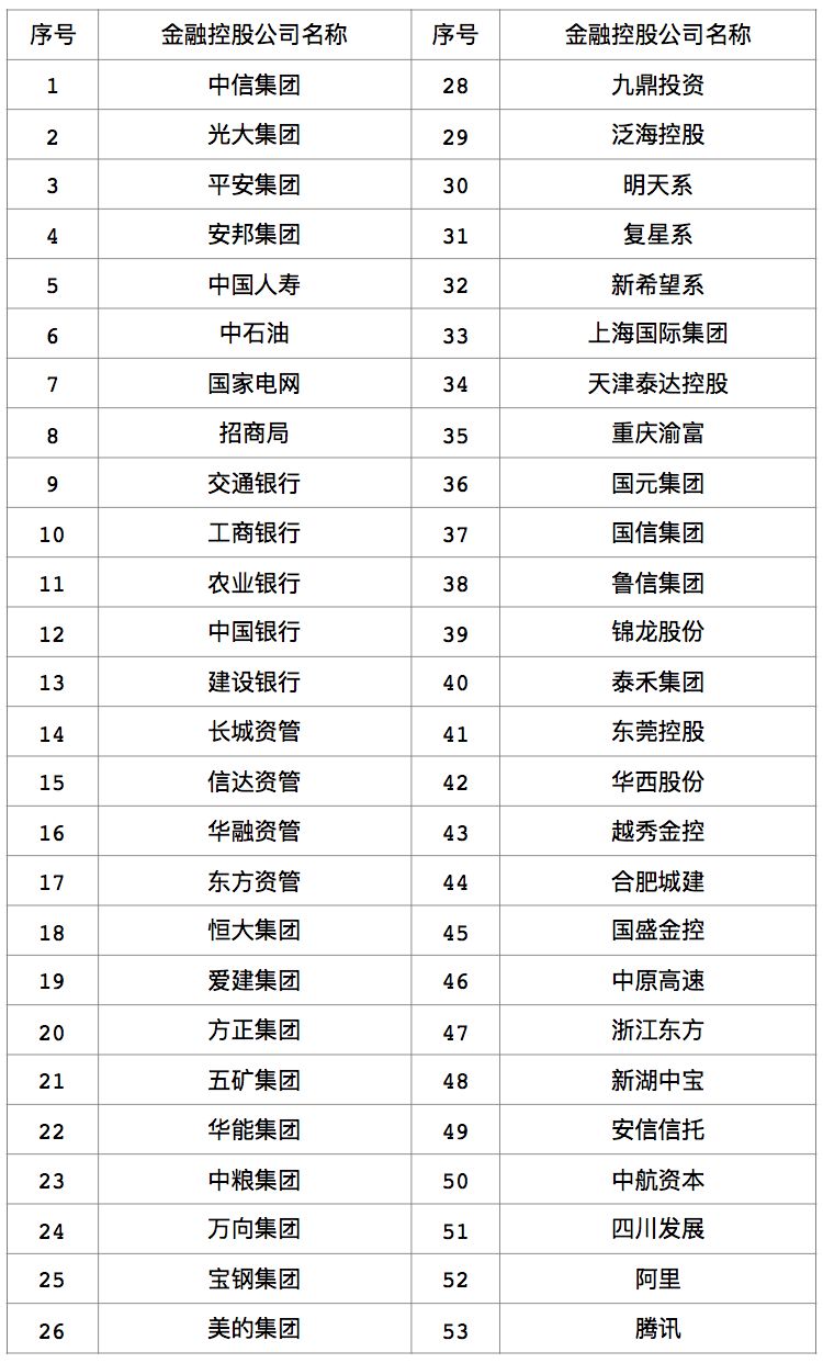 据不完全统计,截至 2016 年末,全国各类金融控股公司已达 53 家 ( 如下表 )。而旗下包括银行、证券、信托、期货、公务基金、租赁、基金子公司、基金销售、第三方支付、小额贷款、典当等 11 个行业 252 家子公司和金控平台。