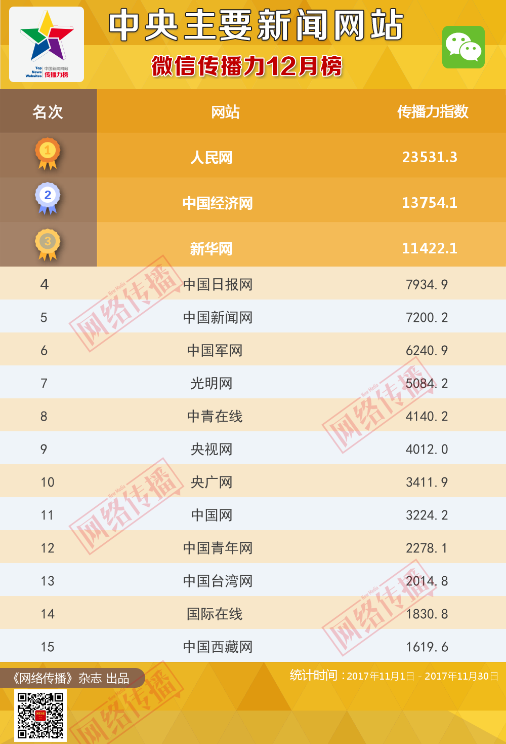 中央主要新闻网站微信传播力2017年12月榜发布