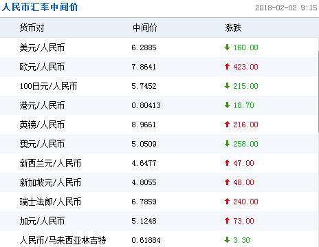 中国人民银行授权中国外汇交易中心公布,2018年2月2日银行间外汇市场人民币汇率中间价为:1美元对人民币6.2885元,1欧元对人民币7.8641元,100日元对人民币5.7452元,1港元对人民币0.80413元,1英镑对人民币8.9661元,1澳大利亚元对人民币5.0509元,1新西兰元对人民币4.6477元,1新加坡元对人民币4.8055元,1瑞士法郎对人民币6.7859元,1加拿大元对人民币5.1248元,人民币1元对0.61884马来西亚林吉特,人民币1元对8.8904俄罗斯卢布,人民币1元对1.8851南非兰特,人民币1元对170.44韩元,人民币1元对0.58434阿联酋迪拉姆,人民币1元对0.59666沙特里亚尔,人民币1元对39.3252匈牙利福林,人民币1元对0.52886波兰兹罗提,人民币1元对0.9470丹麦克朗,人民币1元对1.2480瑞典克朗,人民币1元对1.2161挪威克朗,人民币1元对0.59419土耳其里拉,人民币1元对2.9173墨西哥比索。