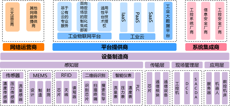 设备制造商主要涵盖感知层、传输层、现场管理层、应用层等工业物联网各层级主要设备厂商。感知层企业包括芯片、RFID、传感器、工业仪表、工业相机、二维码、PLC等企业;传输层则企业主要包括芯片、通信模块、通信设备等企业,主要技术包括工业现场总线、工业以太网、无线传感器网络(5G、NB-IOT、LoRa、BLE)等技术;现场管理层主要涉及厂商包括工控机、DCS、SCADA、FCS等企业;应用层涉及到的设备主要包括服务器、智能装备等。