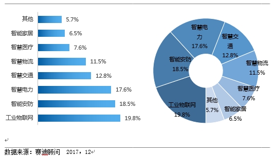 在2016年细分应用领域中,占据物联网市场的19.8%,位居所有行业第一位。展望未来,工业物联网也是物联网应用推广最主要的动力。