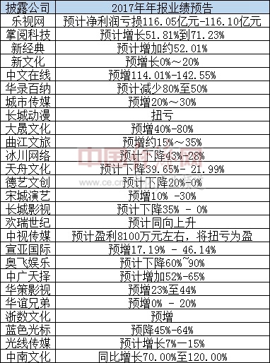 据经济日报-中国经济网记者初步统计,截至1月31日至少有26家文化上市公司披露2017年年报业绩预告,其中18家公司业绩预喜,占比近七成。其中,掌阅科技、新经典、大晟文化、中广天择、中南文化等公司2017年业绩均有望同比增长超过50%。此外,华策影视、华谊兄弟、光线传媒等影视企业业绩也均有望实现同比较大增长。