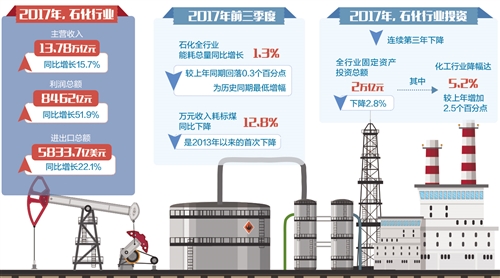 与此同时,行业整体能效也不断提升。数据显示,2017年前三季度,石化全行业能耗总量同比增长1.3%,较上年同期回落0.3个百分点,为历史同期最低增幅。万元收入耗标煤同比下降12.8%,是2013年以来的首次下降。