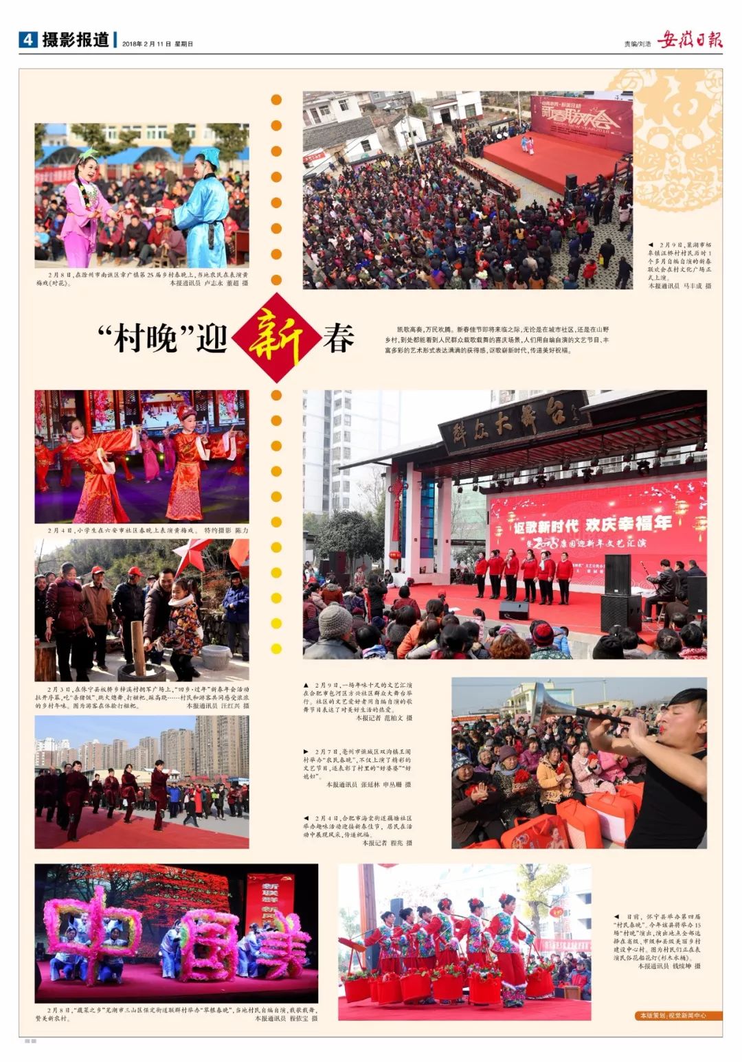 2月8日的《安徽日报》9版以“5篇报道+3幅图片”的整版报道基层一线的鲜活故事。头条《文艺小分队 下乡送“年货”》描绘了铜陵市“迎新春文艺进基层”文艺小分队下乡演出,送“文化年货”的生动画面,反映基层文化部门保障农村群众物质、精神“双小康”的有力措施;《农民办“村晚”欢乐过大年》通过绘声绘色地描写“村晚”现场演出和“有才”的“农民演员”,展现安徽农民的自信自立、活力十足的良好形象;《搬离江心洲开启新生活》以现场采访和生动描写,展现移民搬迁给村民生活带来的新变化;《“团圆房”,农民工温暖的“家”》描写了“夫妻房”“探亲房”这些城市建设者们“临时之家”的温情故事,流露出浓浓的人文关怀;《万二村的“旅游梦”》描绘一个皖南小山村致力于发展乡村旅游产业,让“绿水青山”带来“金山银山”的美好愿景。