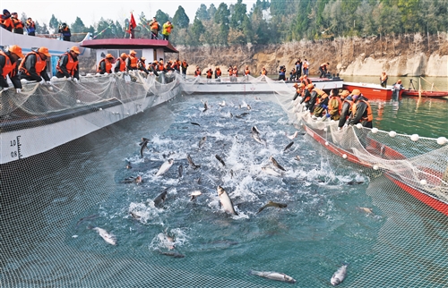 近年来,四川省广元市大力推进白龙湖、亭子湖等淡水湖泊的库区环境系统治理,改善湖泊生态环境。图为2018中国广元·白龙湖亭子湖生态有机鱼开捕仪式。 新华社记者 萧永航摄
