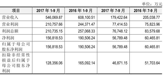 招股书显示,2014年-2017年1-6月,公司的经营业绩在经历持续增长后出现下滑,营业收入分别为8,261,753,751.99元、9,117,253,524.27元、8,900,349,049.83元、3,666,472,225.81元,同比增幅分别为11.17%、10.35%、-2.38%、-9.03%;净利润分别为1,830,536,444.10元、2,619,964,646.35 元、2,740,694,174.47 元、1,000,290,496.15 元,同比增幅分别为15.70%、43.13%、4.61%、-23.08%。