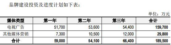 养元饮品本次募资33亿元,其中19亿元用于打广告。具体看来,营销网络建设及市场开发项目中品牌建设投资及进度计划中,第一年投入59,000万元,第二年投入64,100万元,第三年投入66,400万元,合计189,500万元。《国际金融报》报道,养元智汇的招股书中,透露出的是将把“砸钱拍广告”模式进行到底的信息。在养元智汇拟总募集资金 32.6亿元中,约29亿元用于营销网络建设及市场开发项目。