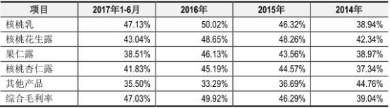 公司称,2014 年-2016 年,公司综合毛利率较高,且逐年上升主要原因是在公司主营业务收入中占比达到 94.90%、95.41%、97.03%的核桃乳的毛利率高且逐年增长。2017 年 1-6 月,公司核桃乳毛利率、综合毛利率出现下滑,分别为 47.13%、47.03%。