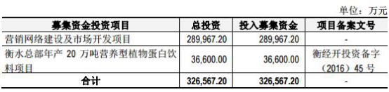招股书显示,养元饮品募集资金总额338,932.65万元,募集资金净额326,567.20万元,发行费用合计(均为不含税金额)12,365.45万元。养元饮品养元饮品本次公开发行新股募集资金将用于“营销网络建设和市场开发项目”和“衡水总部年产20万吨营养型植物蛋白饮料项目”,拟投入募集资金326,567.20万元。