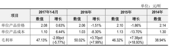 从产品价格来看,2014年-2017年1-6月,公司核桃乳产品价格分别为2.14元/听、2.10元/听、2.06元/听、2.08元/听。