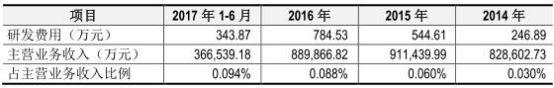 2014年-2017年1-6月,公司研发费用分别为246.89万元、544.61万元、784.53万元、343.87万元。公司研发费用占主营业务收入比例较低的主要原因有二,一是 2005 年末姚奎章先生实际控制公司以来,公司确立并始终践行“六个核桃”大单品战略,在此战略下,公司研发主要围绕“六个核桃”产品的品质提升;二是公司的销售收入基数大。