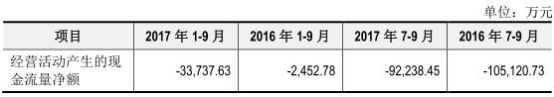 2017年1-9月公司净利润15.68亿 现金流净额-3.37亿
