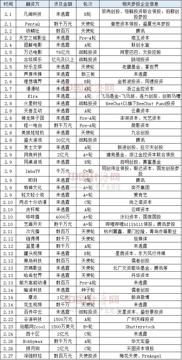 目前已有的资料显示,2月份电影、游戏行业的融资金额领跑,总体融资金额排在前两位的是万达电影和盛大游戏。