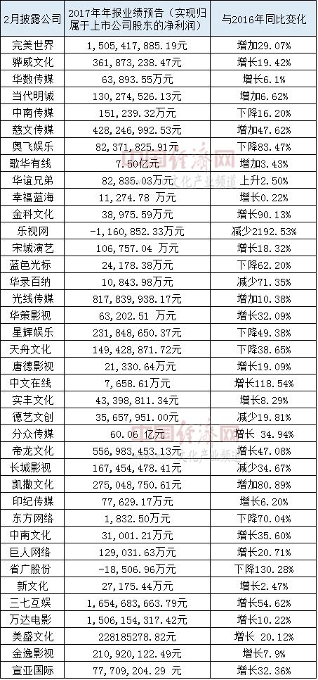 据经济日报-中国经济网记者初步统计,2月份A股有38家文化类企业发布了2017年年报业绩预告,其中27家公司业绩预喜,占比超七成,实现归属于上市公司股东的净利润与2016年相比增长最大的是中文在线,较上年同期增长118.54%。