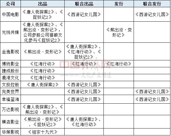 据经济日报-中国经济网记者了解,除了高票房,今年春节档影片的另一大特点是影片出品方更多:《红海行动》32家,《唐探2》和《捉妖记2》均有14家,《熊出没·变形记》12家……资料显示6部新片共101家出品方。不过,从影片背后的投资方来看,上市大公司仍是今年春节档的主角,如金逸影视、中国电影、光线传媒、横店影视、万达影视等公司参与多部影片,如光线传媒、横店影视都参与了《捉妖记2》的出品,万达影视为《唐人街探案2》的主要出品,华策影视为《祖宗十九代》的主要出品,光线传媒为《熊出没·变形记》的出品及发行。