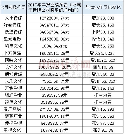 多家文化新三板企业业绩预喜。据经济日报-中国经济网记者初步统计,2月份有17家文化类新三板企业公布了2017年年报业绩预告,其中归属于挂牌公司股东的净利润实现增长的达到10家,其中长江文化归属于挂牌公司股东的净利润超亿元,达到1.06亿元,同比增长10.60%。长江文化解释营收增长主要是公司的影视剧板块业务进一步发展壮大;而净利润增长主要是公司优化各业务板块,所得税较上年相比大幅减少所致。