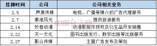 5家文化类企业挂牌新三板。2018年2月新三板总共新增挂牌企业88家,其中与文化类相关的企业共有5家,分别是声屏传媒、秦淮风光、妙音动漫、天一文化、影众传媒。