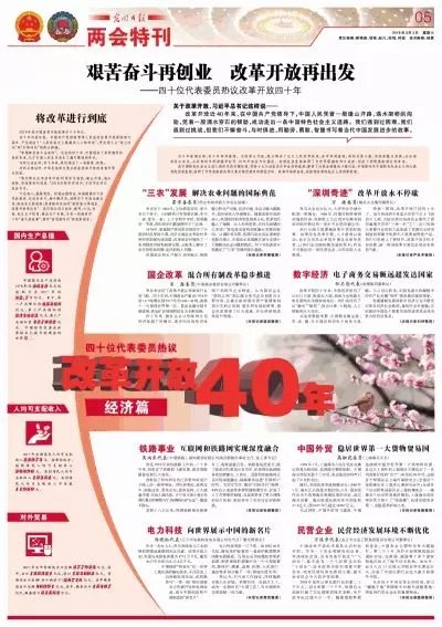 《光明日报》的《两会特刊》选择在3月3日全国政协十三届一次会议开幕当天推出,特刊共有5个整版,从经济、教育、文化、科技、民生5个方面带领读者回顾了40年“春天的故事”。这组《艰苦奋斗再创业,改革开放再出发》的报道,汇集了来自多个行业代表委员的心声,也向读者呈现了一个蓬勃发展中的多彩中国。