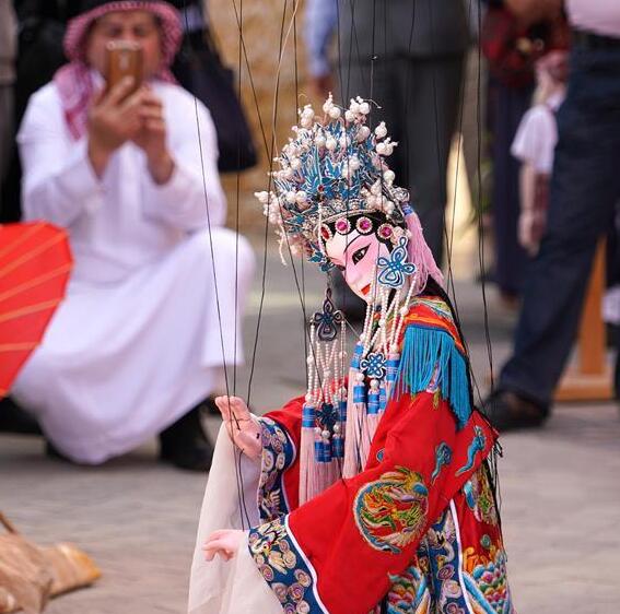 3月8日,在约旦佩特拉,艺术家表演中国浙江泰顺的传统提线木偶。