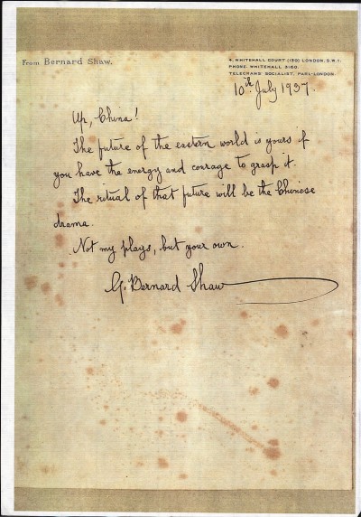 萧伯纳在给黄佐临的题词手稿上写道:“起来,中国:东方世界的未来是你们的”