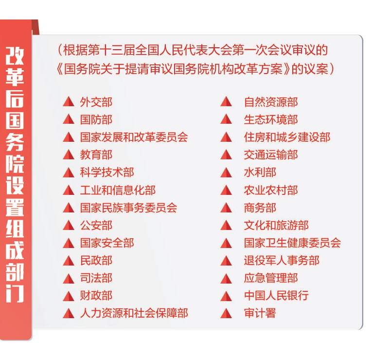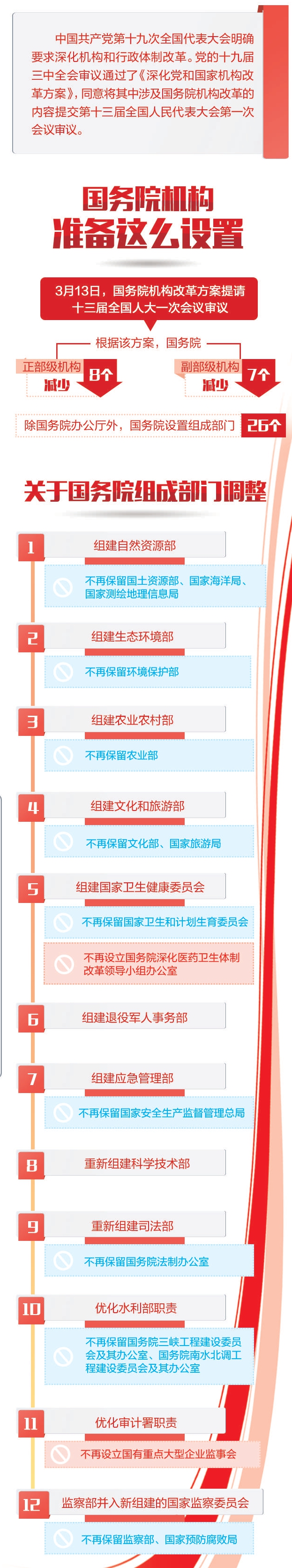 不久前闭幕的党的十九届三中全会审议通过了《中共中央关于深化党和国家机构改革的决定》和《深化党和国家机构改革方案》,同意把《深化党和国家机构改革方案》的部分内容按照法定程序提交十三届全国人大一次会议审议。国务院机构改革方案正是根据上述精神形成的。