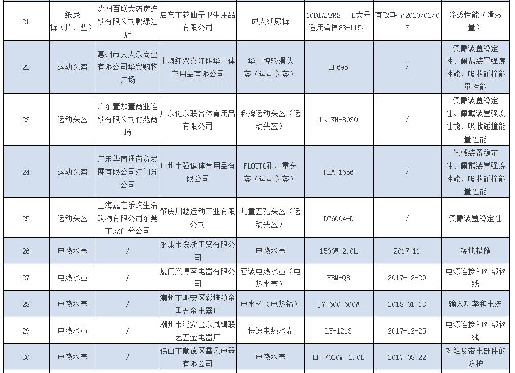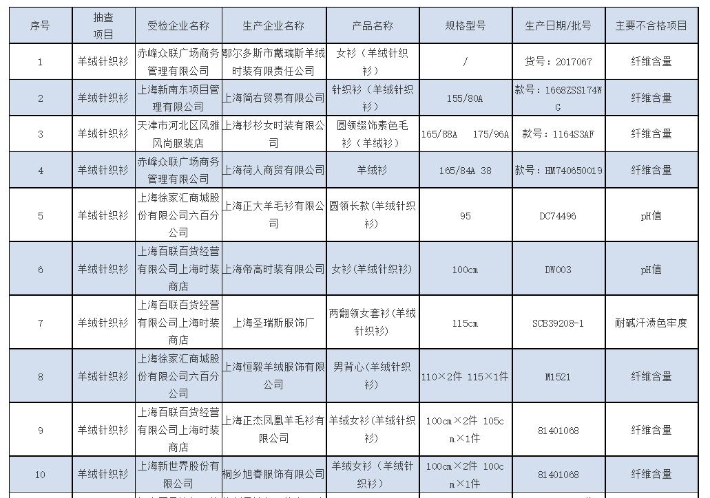 36批次不合格产品中,羊绒针织衫12批次产品不合格,不合格项目涉及甲醛含量、pH值、耐碱汗渍色牢度、纤维含量;运动头盔4批次产品不合格,不合格项目涉及佩戴装置稳定性、佩戴装置强度性能和吸收碰撞能量性能;衬衫8批次产品不合格,不合格项目涉及纤维含量项目;电热水壶5批次产品不合格,不合格项目涉及对触及带电部件的防护、输入功率和电流、电源连接和外部软线、接地措施;纸尿裤(片、垫)1批次产品不合格,不合格项目涉及产品渗透性能(滑渗量);电能表6批次产品不合格,不合格项目涉及基本误差、潜动、高频电磁场抗扰度、交流电压试验。