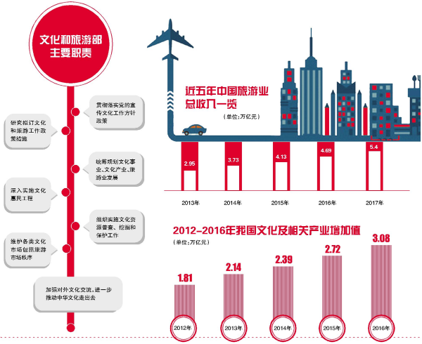 国务院机构改革方案中提出,将文化部、国家旅游局的职责整合,组建文化和旅游部,作为国务院组成部门。其主要职责是,贯彻落实党的宣传文化工作方针政策,研究拟订文化和旅游工作政策措施,统筹规划文化事业、文化产业、旅游业发展,深入实施文化惠民工程,组织实施文化资源普查、挖掘和保护工作,维护各类文化市场包括旅游市场秩序,加强对外文化交流,进一步推动中华文化“走出去”。
