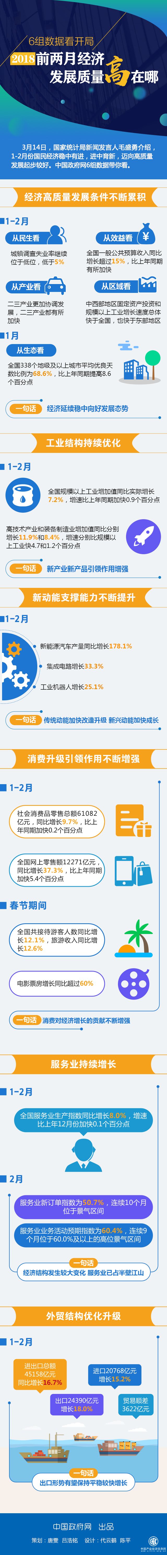 3月14日,国家统计局新闻发言人毛盛勇介绍,1-2月份国民经济稳中有进,进中育新,迈向高质量发展起步较好。中国政府网6组数据带你看。