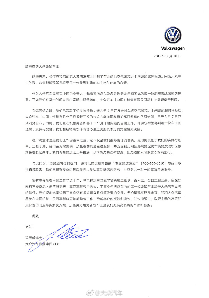中新网客户端3月18日电(记者 吴涛)18日晚间,大众汽车对外发布《至大众途锐车主的信》,称对于315晚会曝光的途锐缺陷问题,正在筹备下月实施的召回计划,有信心通过实施技术方案消除相关缺陷,其还将为车主提供一次免费的机油更换服务,并为受到此问题影响的途锐车辆的发动机保修期免费延长两年。
