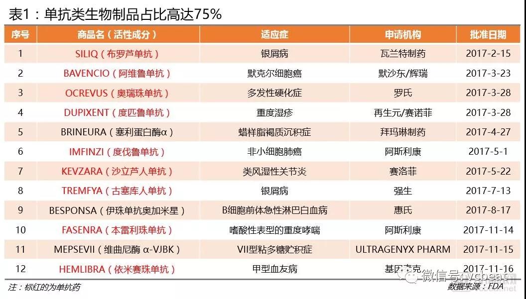 单抗类新药数量最多:从2017年FDA批准的生物制品名单看,单抗类药物有9个,占比高达75%。