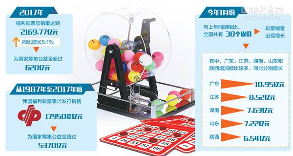 数据显示,2017年福利彩票总销量达到2169.77亿元,同比增长5.1%;为国家筹集公益金超过620亿元。自1987年福利彩票发行销售以来至2017年底,我国福利彩票累计发行销售17950多亿元,为国家筹集公益金超过5370亿元。