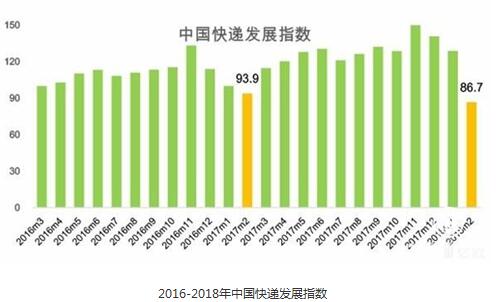 日前,国家邮政局发布《2018年2月中国快递发展指数报告》。《报告》显示,2018年2月中国快递发展指数为86.7,同比降低7.7%。受春节假期影响,快递服务进入业务淡季,发展规模指数和发展能力指数均出现下降。主要品牌快递企业“春节快递不打烊”,较好地保障了揽派服务的平稳运行,服务质量指数表现较好;发展趋势指数保持稳定。