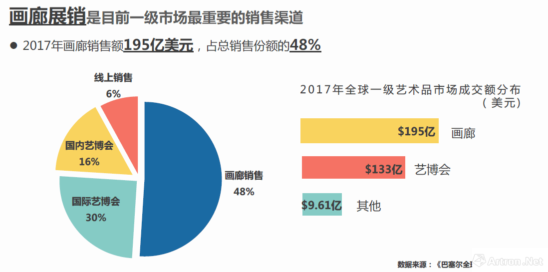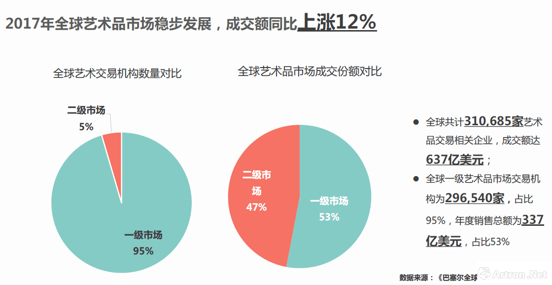 据《巴塞尔全球艺术市场报告2018 》统计,2017年全球共有310,685家从事艺术平交易的相关企业,同比去年增加7.3%/其中,其中全球一级市场艺术机构共有296,540家,二级市场艺术机构共有14,145家。全球艺术品交易成交总额为637亿美元,同比去年增长12%。其中,一级市场交易总额为337亿美元,占全球总市场份额的53%,同比2016年增长4%。 在全球一级市场中,画廊的总成交额为195 亿美元,占全球一级市场销售份额的48%。可见,画廊展销是一级市场最重要的销售渠道。中国一级艺术品市场与西方还有一定的差距,一级市场交易机构数量仅占全球总数量的9%。
