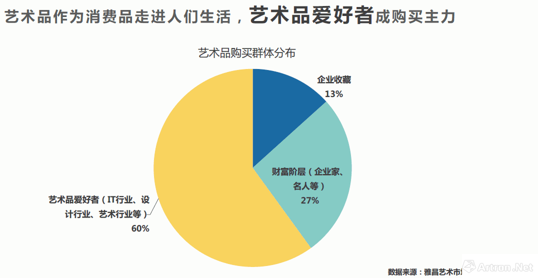 国内一级市场主要的收藏群体是艺术品爱好者,占总体市场份额的60%,艺术品从收藏逐渐转变为艺术品消费;企业家和名人收藏占整体比重的27%,企业收藏占13%。