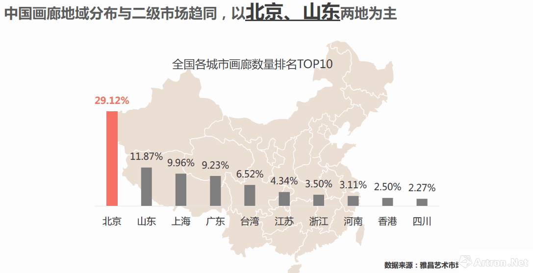 聚焦中国画廊市场, 中国画廊的地域分布与二级市场基本趋同。据雅昌数据统计,2017年全国共计4399家画廊,中国十大画廊城市中,北京占比29.12%,上海占比9.96%,香港,占比3.43%。