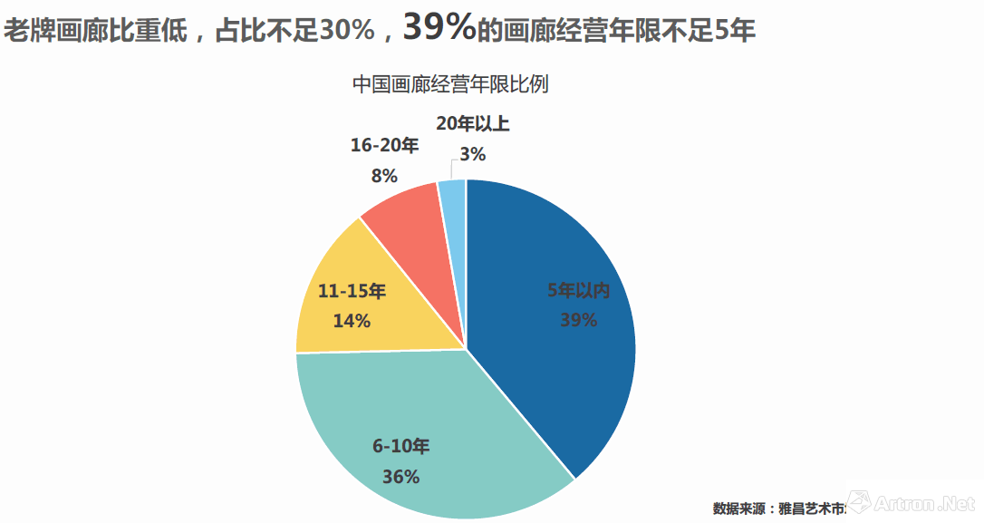 中国画廊发展历史较短,老牌画廊比重低,国际上50%的画廊经营在20年以上,而中国经营年限在20年以上的画廊仅占3%;画廊经营以十年为一个坎,国内画廊经营年限在10年以内的约占75%。