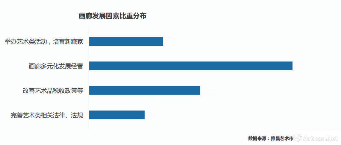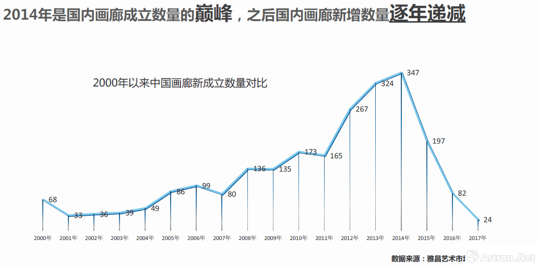 这一趋势与国际画廊的发展趋势趋同。一方面,说明国内、外画廊运营成本都有所增加,导致新增画廊数量明显减少;另一方面也说明画廊行业进入将新常态,画廊的运营也逐渐趋向正规化和专业化。沉淀下来的画廊不论是在专业性、学术性还是商业运作方面都有自己的营生之道。