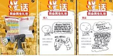 黑龙江日报推出的《漫画两会民生礼包》,采用逐帧动画使手绘漫画得以生动展现,生动形象地展现政府工作报告中百姓关心的民生话题,从“就业”“教育”“健康”等不同角度进行漫画解读,让两会政府工作报告变得妙趣横生,让人一目了然。这款H5动画通过网、端、微同步推送,使传播更加迅速和广泛。