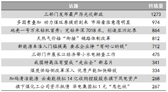 本期,国家发改委、财政部、国家能源局联合发布的《关于2018年光伏发电有关事项的通知》在行业内引发热议;油气方面,国家发改委发布《关于理顺居民用气门站价格的通知》,居民用天然气和非居民用气价格实施“衔接”,受到媒体、行业人士、民众多方关注;煤炭方面,受多重因素影响,动力煤夏旺季提前来临,市场预期分歧明显。