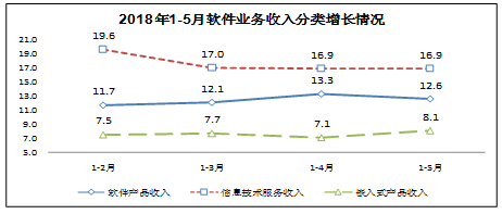 信息技术服务收入较快增长,在线运营及平台类信息技术服务收入增势突出。软件技术加快在各领域应用,使服务化发展的进程不断推进,1-5月全行业实现信息技术服务收入12988亿元,同比增长16.9%,增速同比提高1.2个百分点,在全行业收入中占比为55.7%。其中运营相关服务收入增长24.2%,同比提高2.6个百分点;电子商务平台技术服务收入增长17.5%;集成电路设计收入增长5.8%;其他信息技术服务(包括信息技术咨询设计服务、系统集成、运维服务、数据服务等)收入增长14.5%。