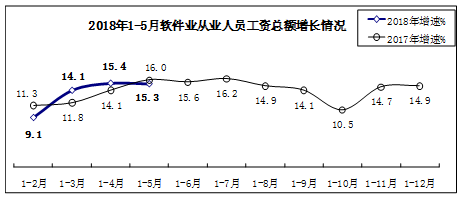 从业人数稳步增加,工资水平较快增长。1-5月,我国软件和信息技术服务业从业平均人数增长5%,增速同比提高0.5个百分点;从业人员工资总额增长15.3%,增速同比回落0.7个百分点;人均工资增长9.8%。