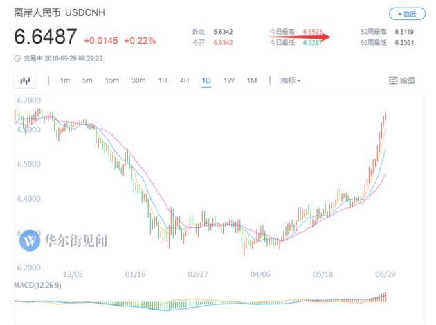 中间价公布后,离岸人民币兑美元汇率早间快速下跌,盘中跌破6.65关口,创下2017年11月底以来的新低。