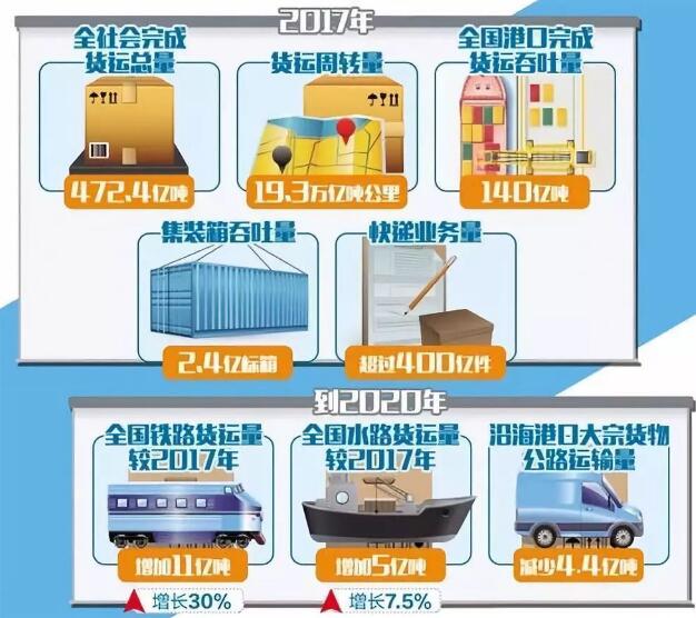 国务院新闻办公室7月2日举行国务院政策例行吹风会,介绍我国调整交通运输结构提高综合运输效率有关工作情况并答记者问。交通运输部副部长刘小明在会上表示,交通运输部制定了推进运输结构调整三年行动计划,目标到2020年实现全国铁路货运量较2017年增加11亿吨、增长30%,水路货运量较2017年增加5亿吨、增长7.5%,沿海港口大宗货物公路运输量减少4.4亿吨。