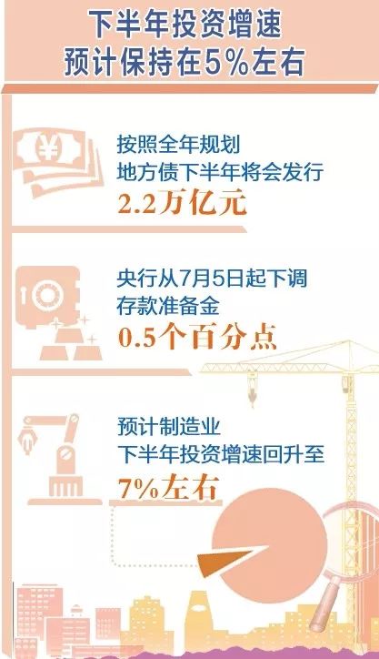 随着地方债供给规模逐步加大,且央行从7月5日起下调存款准备金0.5个百分点,将释放一定的流动性,基建资金来源压力将有所缓解。基建投资增速下滑局面将在一定程度上得到缓解,预计下半年投资增速将保持在5%左右。